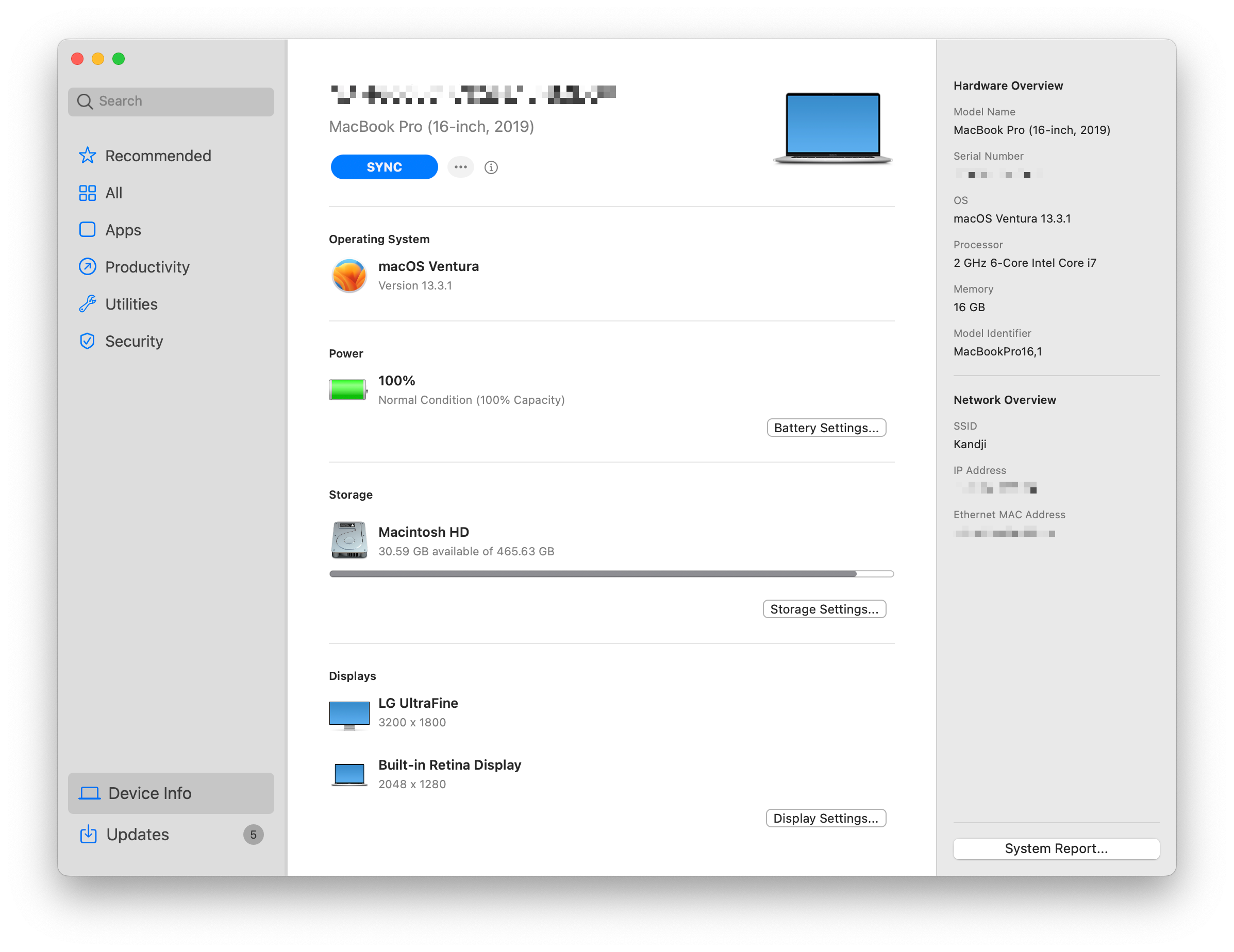 The Device Info tab is a brand new section. End users can now see key device information—such as OS version, power percentage, storage capacity, and even connected displays—on a single page. They also have one-click access to see more detail in System Settings and to copy key attributes for IT support. There is also a Sync button now, which allows end users to easily initiate device check-ins when requested by their IT administrators.