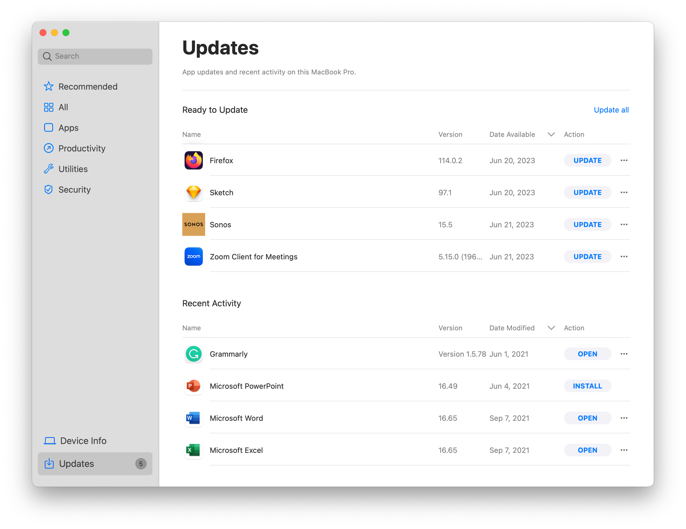 The Updates tab is a refresh of the previous Activity tab. End users can now see all applications installed through Self Service, with available updates grouped at the top of the page.