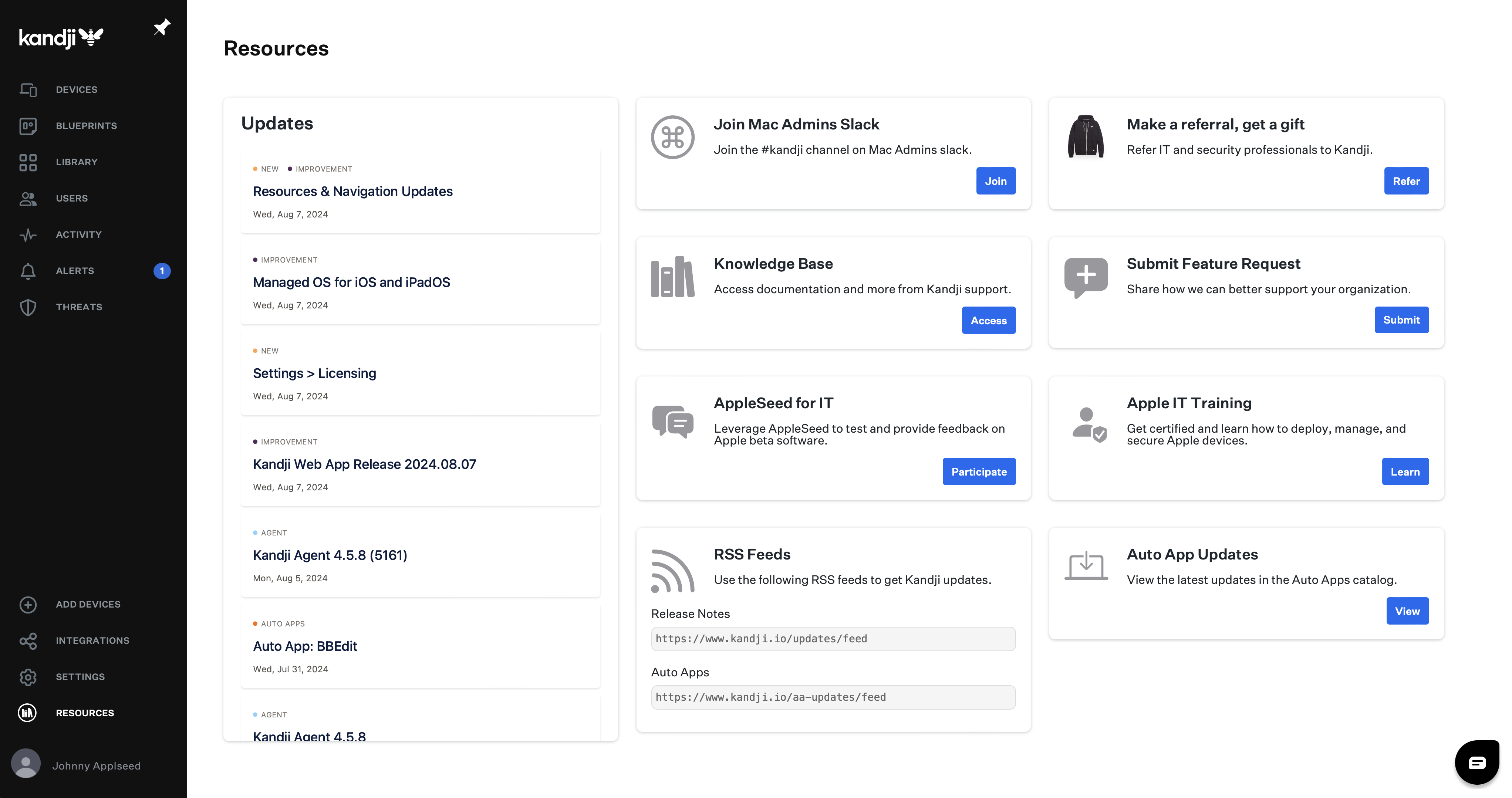A new resources page can be found in the bottom of the left hand navigation menu. The resources page contains common links for Apple IT admins, along with an embedded view of our product updates changelog.